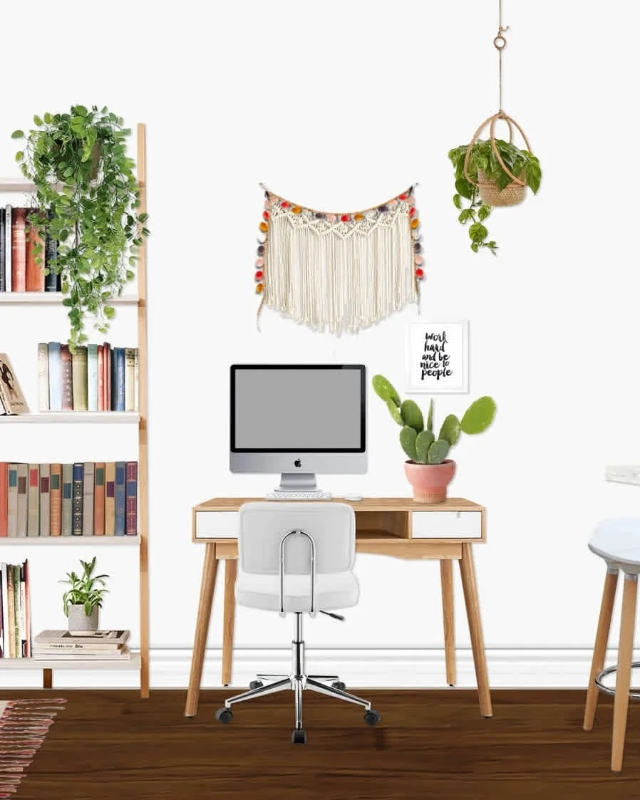 Since I work from home, a comfortable workspace is super important to me. I think we nailed it, because I feel uber productive, creative, and happy in my little home office! We're still growing our plant collection, and I'd love to work in some macrame like Erika's original rendering below. But, for now, we're happy with it and want to space out our purchases.