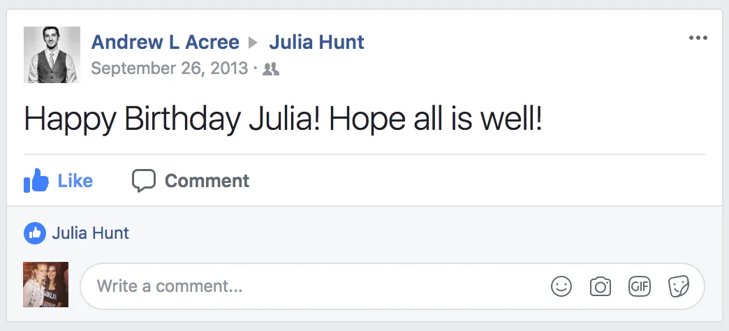 Had I not been too shy to really talk to Andrew in 8th grade, we probably would have dated in high school and broken up. Instead, I dated someone else who we will call "LD". LD ended up being my first love and my first heartbreak (this is important later). Andrew and I wouldn't connect again for another 8+ years. Minus the occasional Facebook wall post like the below, haha.